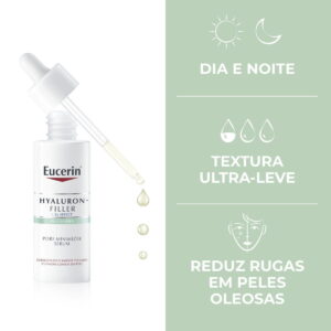 Eucerin Hyaluron-Filler Pore Minimizer Sérum Facial Antirrugas preenche rugas e linhas finas, com o Ácido Hialurônico. A fórmula também inclui Ácido Glicólico, que remove as células mortas da pele, e Ácido Lático, que reduz os poros visíveis. Com resultados visíveis em apenas 2 semanas, tem textura sérum ultraleve de rápida absorção. É ideal para peles oleosas.NART: 83587-03400-23